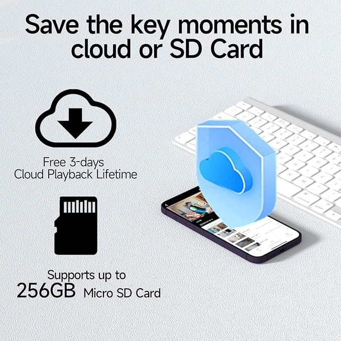 - 【SD & FREE Cloud Storage】Install [O-KAM] APP (IOS/Android) to set up the security camera. Free 3-day rolling cloud storage for life(No subscription is needed). The videos can be saved at Micro SD card card(NOT included, up to 256GB). If you have any questions with the camera, please find our customer service team on manual instruction.