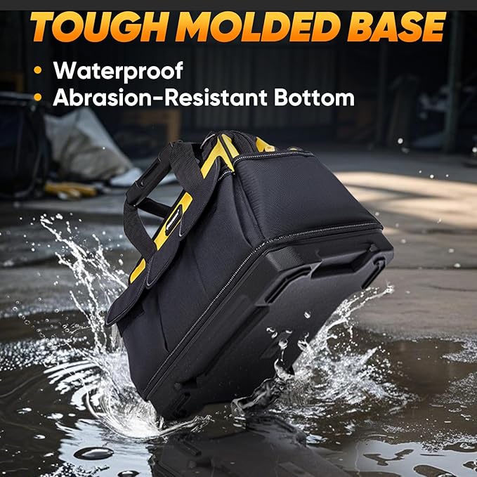 - ๐ [PRACTICAL AND FUNCTIONAL] Wide mouth opening makes loading larger tool easy. 8 side pockets on the outside give you easy access to small tools you need the most. Molded base makes bag bottom waterproof and abrasion-resistant. It also helps to maintain the shape of this tool storage tote.