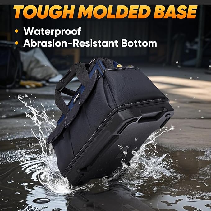- ๐ [PRACTICAL AND FUNCTIONAL] Wide mouth opening makes loading larger tool easy. 8 side pockets on the outside give you easy access to small tools you need the most. Molded base makes bag bottom waterproof and abrasion-resistant. It also helps to maintain the shape of this tool storage tote.
