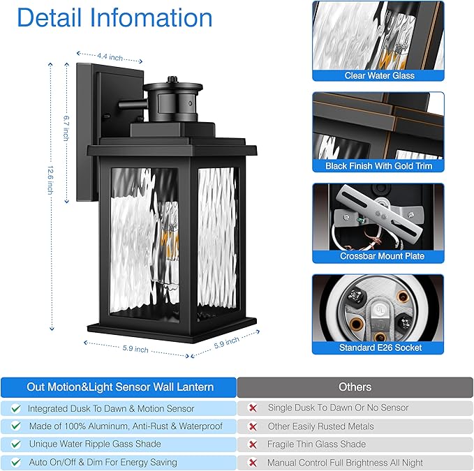 - 🌟【Distinctive Design】The lantern lights feature clear water-tempered glass that beautifully complements the style of your home. The water ripples glass provides a beautiful texture and allows plenty of lighting to illuminate your outdoor space. This outdoor porch light is designed to create a warm and charming atmosphere around your house, making it an excellent addition to any home decoration.