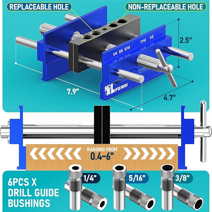 - Multiple Applications: Our jig features 4 holes along the top, with 2 of the holes accepting threaded bushings that can be replaced with sizes 1/4", 3/8", and 5/16", and the other 2 holes accepting 7/16" and 1/2" drill bits, making it a versatile tool for a wide range of woodworking projects.