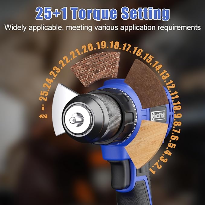 - 25+1 Position Clutch and 2-Speed Settings: The power drill's 25+1 torque settings and 2-Speed (0-420, 0-1500 RPM) allow precise adjustments, effectively preventing screws from being sunk too deep, stripping their heads, or even breaking their shafts