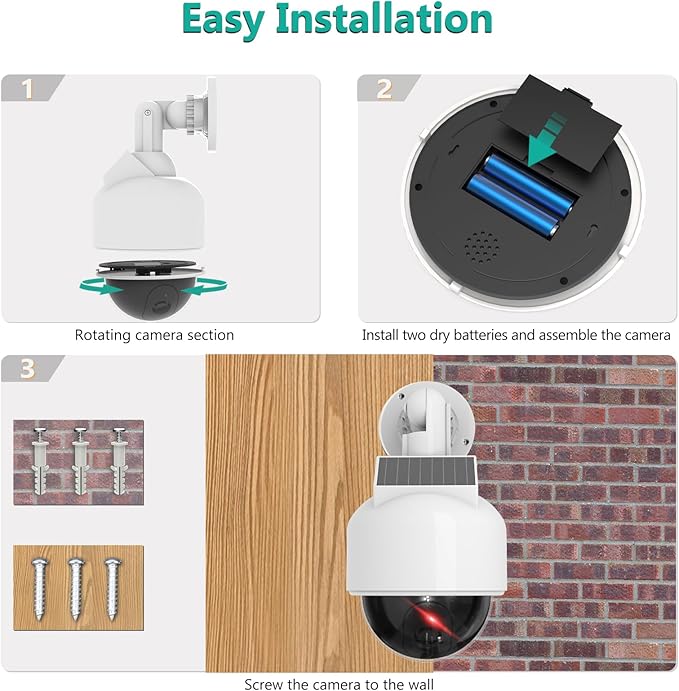 - Wireless Dual Energy Simulated Surveillance: Effortlessly mimic real security with this wireless dummy camera, providing a convincing deterrent without the hassle of wires. Powered by both solar energy and batteries, ensuring continuous operation and flexibility in various environments. Harness the sun's energy or rely on batteries for uninterrupted security.