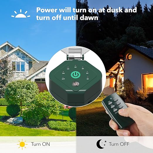 - 【With Photocell Light Sensor】This outdoor power stake timer features a photocell sensor that detects outdoor light levels, automatically turning your Christmas or Halloween lights on and off. It works with a variety of outdoor lighting and appliances, including Christmas lights, Halloween decorations, rope lights, fans, and mini fountains for patios, balconies, garages, and basements.