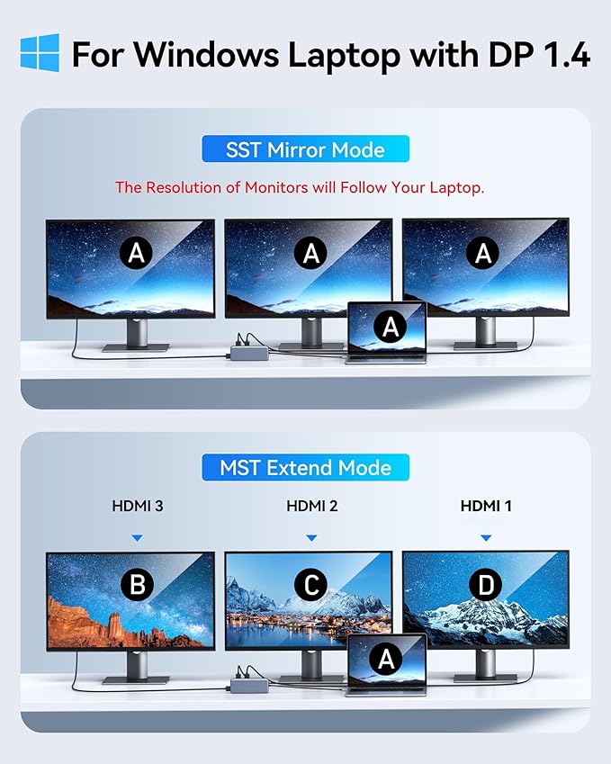 - 【Docking Station 3 Monitors】12 in 1 Triple Display Docking Station allows you outputting triple display. WINDOWS mirror mode:All HDMI output resolution will follow your laptop, WINDOWS extend mode:HDMI 1 + HDMI 2 + HDMI 3 display Display three different screens simultaneously. MAC OS:M1 and M2 Chip Supports displaying three identical screens.(All of the above mode is based on DP1.4 laptop and monitor)