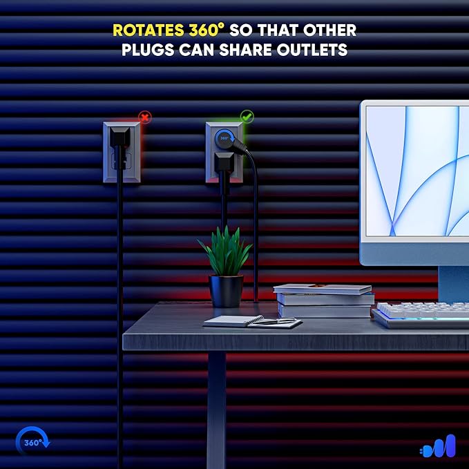 - SPACE SAVER: Convert your standard AC power cord to a slim rotating plug, providing angular flexibility. Plug into the top outlet and still have usage of the bottom outlet with this rotating cord.