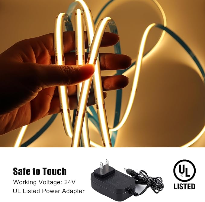- Flexible COB LED strip light, wide range of applications. This is an ideal indoor decorative lighting, dimmable COB LED lights for living room, bedroom, tool room, kitchen under cabinet lighting, under bed lights, TV backlight, wall, computer desk, stairs, display case, etc.
