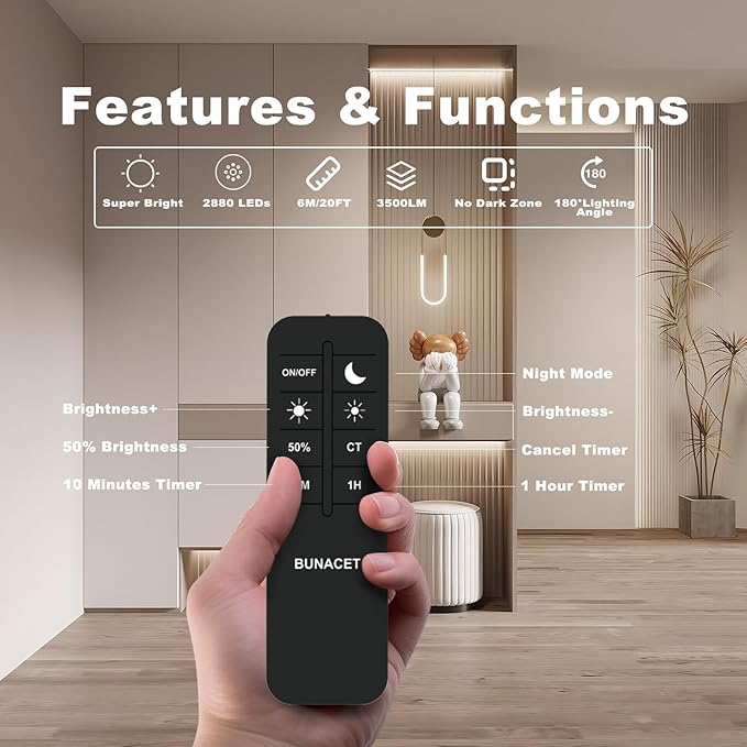 - White COB LED strip light with RF remote, 360 degree all-round controllable, the RF remote control distance up to 49ft - 66ft (15-20 meters), perfect to make up for the shortcomings of IR remote control. Dimmable LED strip lights with night mode, timing and memory function, it will remember the state when it was last turned off, and the mode and brightness will be the same as the last one when it is turned on again.