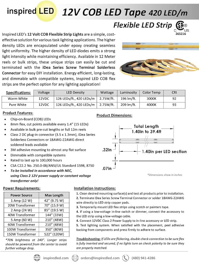 - To be installed in accordance with NEC, using Class 2 12V power supply or constant voltage transformer