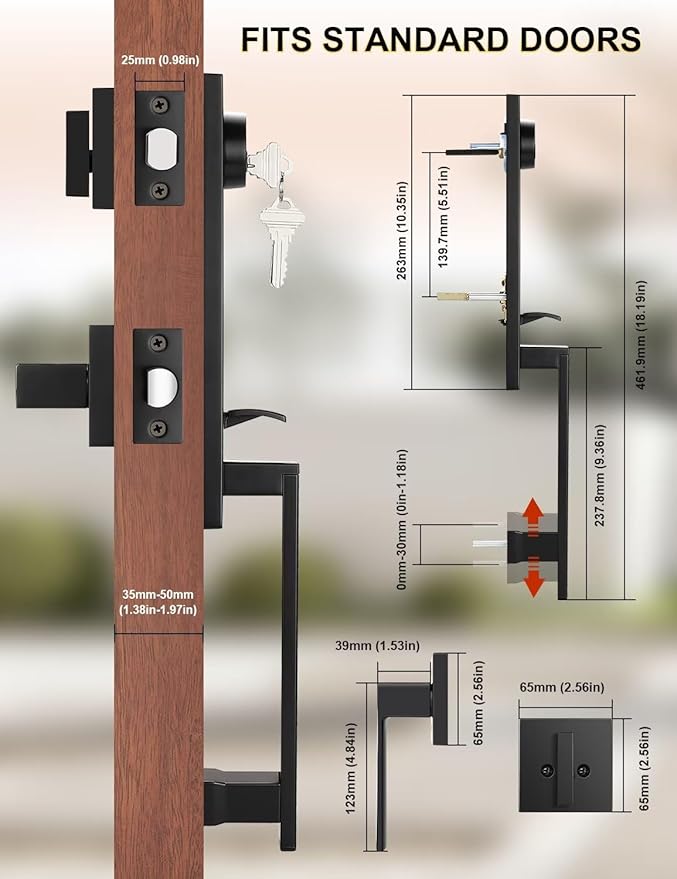 - FITS STANDARD DOORS: Full Escutcheon Handle Set prefer for standard-sized doors in thickness 1-3/8" to 1-3/4" (35-45mm). With 2-3/8’’ - 2-3/4’’ (60-70mm) backsets to accommodate various door configurations,it suitable for various front doors, including residential homes, offices, apartments.