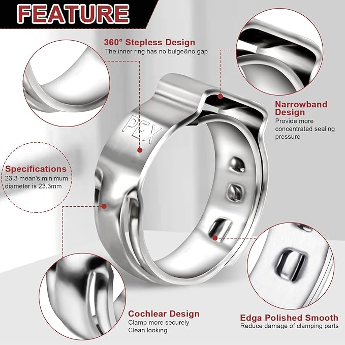- ✅[Upgrade Structure] This style ear hose clamps over the screw type clamps, these are easier to install, clamp more securely, and fast. The cinch crimp rings are designed to provide a secure and tight seal, ensuring that the PEX tubing pipe fitting connections remain leak-free