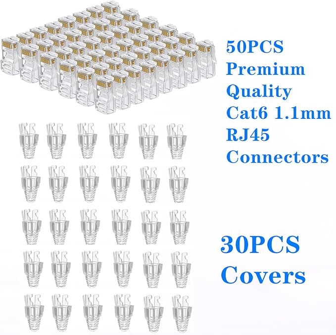 - Premium Quality 50pcs rj45 1.1mm Cat6 Pass Through Connectors, 30pcs Covers: It comes with 50pcs nice quality rj45 1.1mm cat6 pass through connectors, let the network faster, enough for we use. It also comes with 30pcs covers for j45 cat5, cat5e, cat6 connectors ( Covers not for cat6A, cat7 connectors ect).