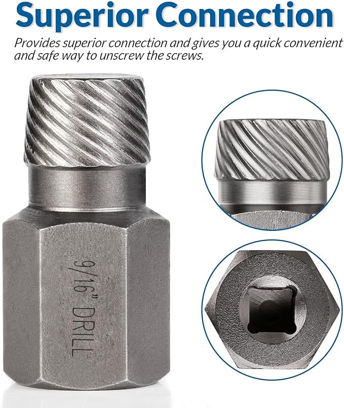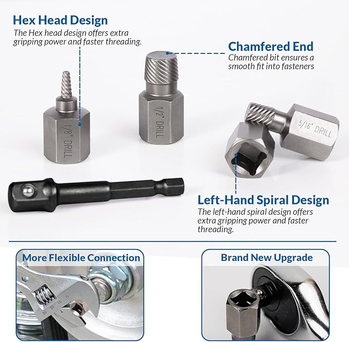 - 【Versatile usage】Suitable for both power tools and hand tools, including Wrench/ Ratchet/ Drill/ Impact. The high-density spiral design helps faster remove broken screws, bolts, nuts, studs, fittings, threaded pipes, and pins. Not only as automotive tools, but also as a helper of home decor or craft production.