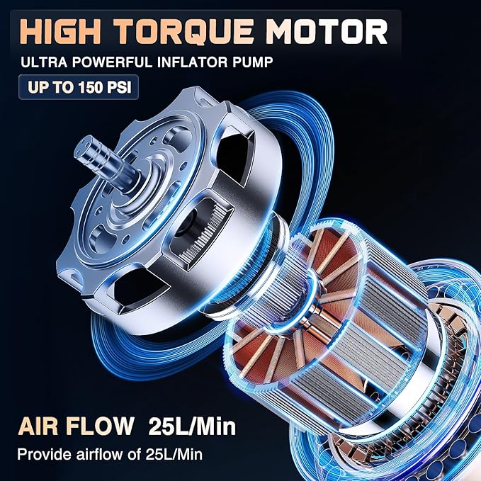- Cordless Tire Inflator: The inflation pump is equipped with three rechargeable 7800mAh battery, which can quickly Tire the car without relying on the cigarette lighter power supply. This portable air inflator has a built-in high-performance chip that quickly inflates tires and provides 25 L/min of airflow. The cylinder specification of this pump is 25mm, which only takes less than 2 minutes to inflate the tires of SUV cars.