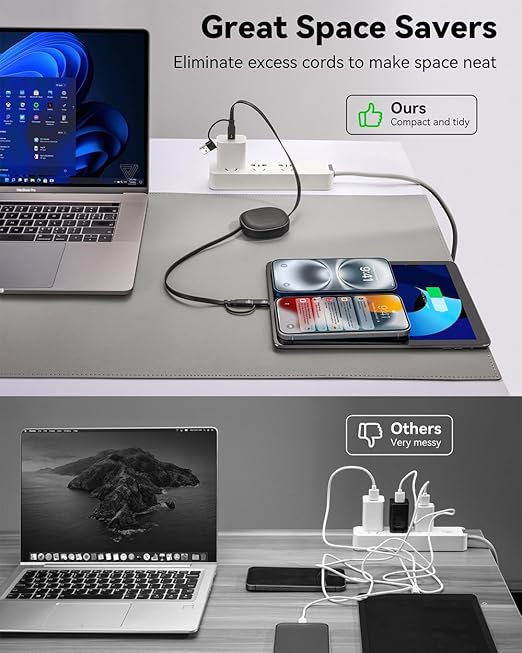 - ⚡【Adjustable Length and Retractable】: It can extend from 0.6ft to 3.8Ft/1.16M and adapts to different daily situations. With a retractable design, you just pull out both ends of the cable at the same time, it will automatically retract to the original position. Easy to place in your handbag, laptop bag, or pocket. Say goodbye to tangled cables and a messy charging environment. it's all in one convenient retractable cable!