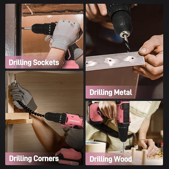 COMOWARE Cordless Drill Set, 20V Pink Power Drill Set for Women, 1 Battery & Charger, 3/8" Keyless Chuck, 2 Variable Speed, 266 In-lb Torque, 25+1 Position, with Pink Storage Bag