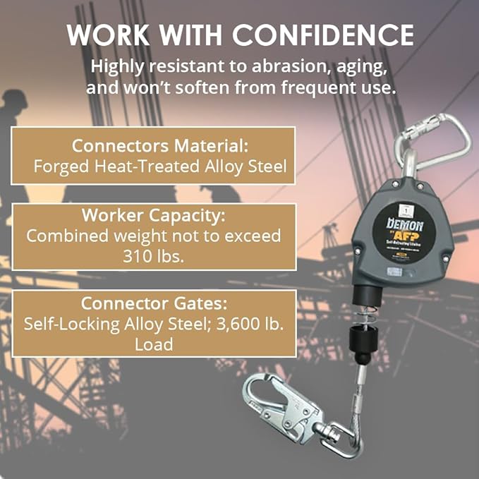 - ✅SAFE – The industry’s lightest 11’ SRL, at only 6lbs., it weighs as much as most 6FT retractable on the market. The AFP 11 FT single-leg self-retracting lifeline is made with a smooth, lightweight, high-strength galvanized cable wire rope to reduce impact forces with a heavy-duty double-locking gate. The swivel top housing and hook feature prevents twisting and binding to reduce the risk of falls and fatigue.