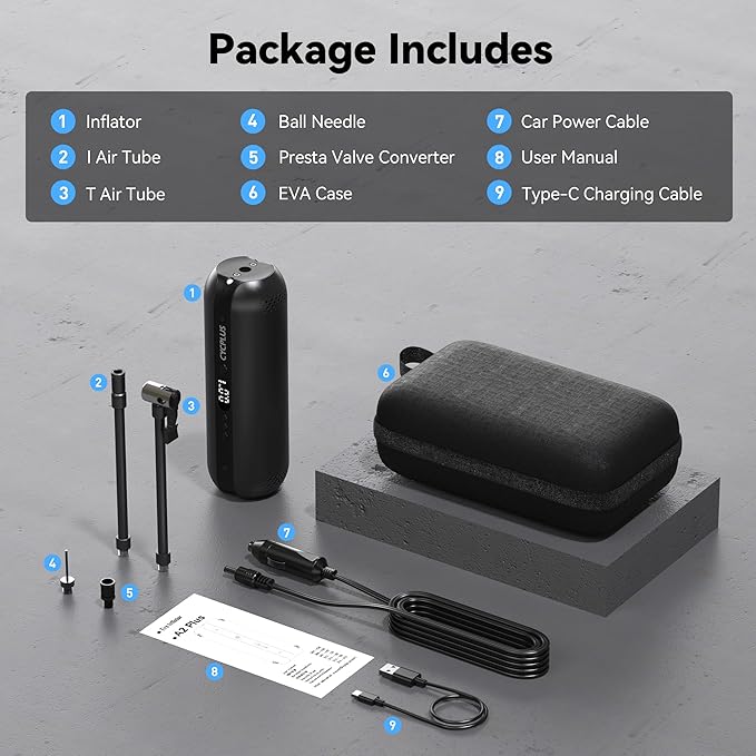 - 【Perfect Gift】: Small and compact car air pump that fits in your glove compartment or trunk and is always ready for use. Perfect gifts for men. The package consists of 1 x car tire inflator, 2 x air hose, 1 x general nozzle cone, 1 x needle adapter, 1 x Presta adapter, 1 x USB-C charging cable, 1 x carrying bag and 1 x instruction manual