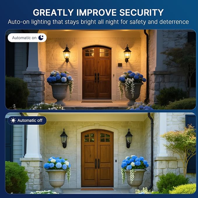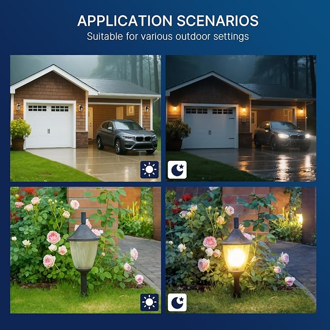 - Wide Outdoor Application : Suitable for a variety of outdoor locations including but not limited to: gardens, driveways, patios, porches, entrances, yards, garages, alleys, and pathways. With its automatic on/off functionality, it is ideal for areas where illumination is desired during the night and low visibility hours