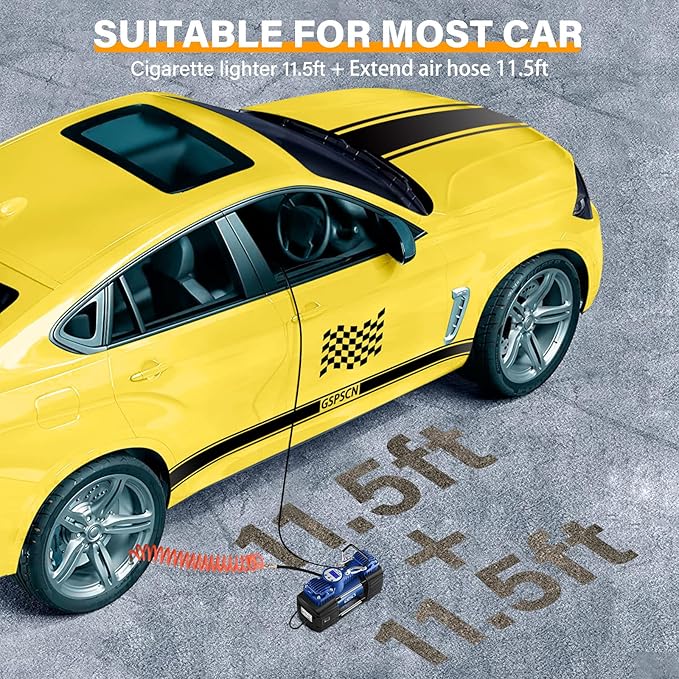 - 【INFLATION IN SECONDS】: Unlike regular air compressor tire inflators that take ages, ours gets the job done in 1.5 minutes or less. With double cylinders, this 12V portable air compressor maxes out at 150 Psi and produces a flow of 70L/min; 4X faster than others.