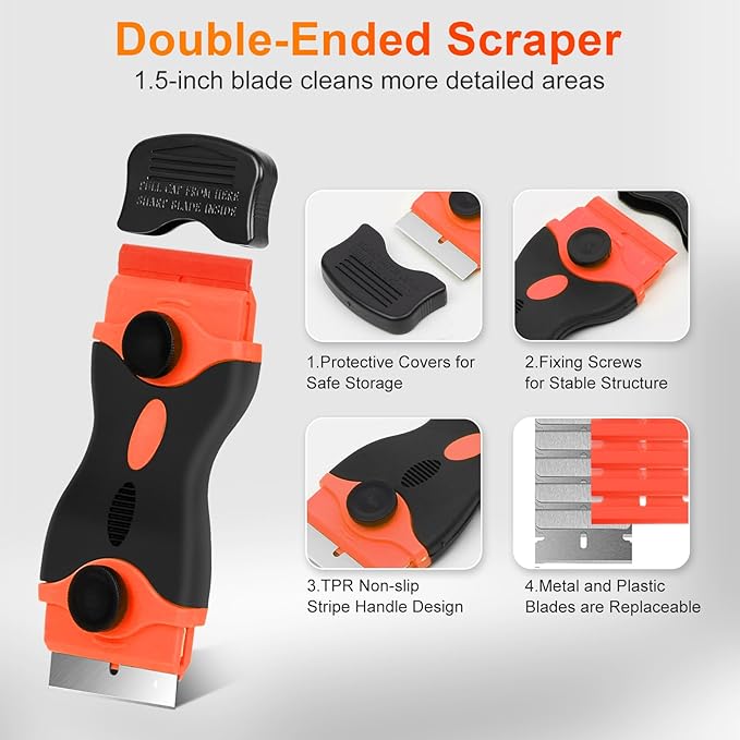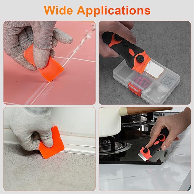 - [Safe and Portable]: The blade scraper incorporates double safety protection with fixed blades and safety protective covers, ensuring a secure structure and reducing the risk of accidents during storage. The caulking tool's compact size makes it easy to carry and suitable for use in small spaces, while the metal blade effectively tackles stubborn stains without causing damage.