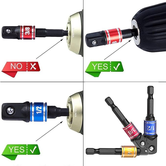 - 【An always-handy socket adapters set】Socket adapter set is often used with others tools in order to fit different size sockets onto the same fastener head. Drill socket adapter increase versatility and can make life easier during complicated maintenance jobs. Color code helps easily read and identify the right one. Detent ball keep sockets from coming off during use