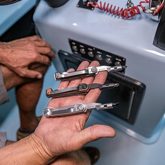 - 8-IN-1 MULTI-TOOL: Features a plain edge blade with frame lock, two-sided 1/4" bit driver, pry bar, hammer, awl, saw, bottle opener, and pocket clip