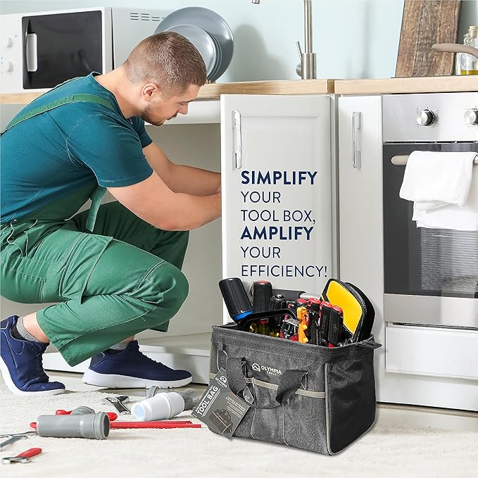 Olympia Tools Tool Bag 12 Inch, Heavy Duty Tools Bag with 3 Large Pockets, Adjustable Shouder Straps and 600D Reinforced Material