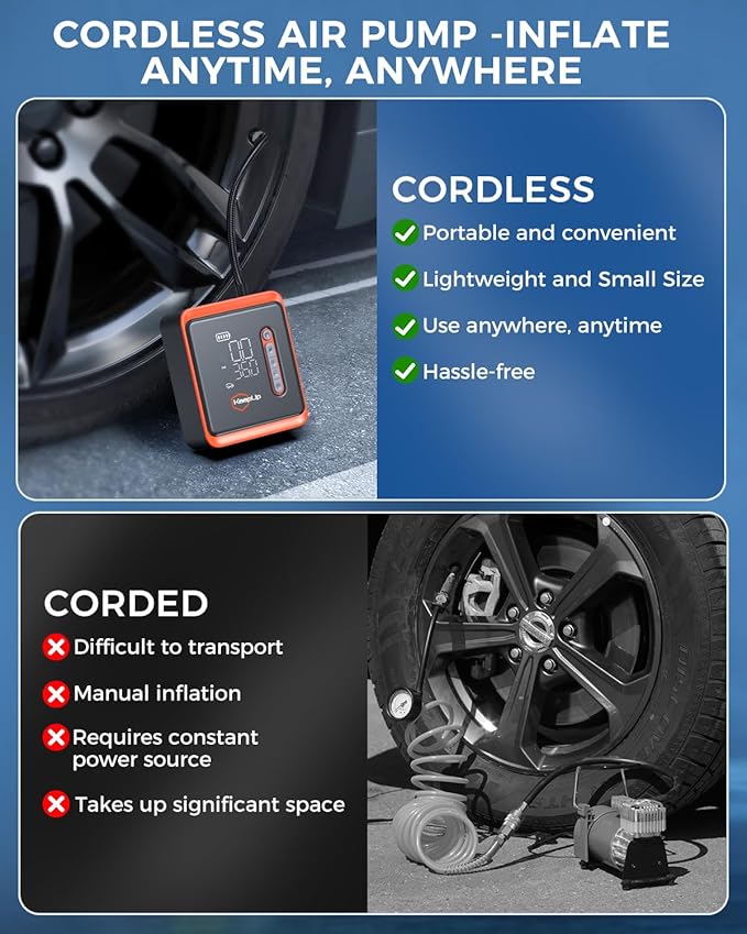 - ๐ ๐๐ฌ๐ญ ๐๐ง๐๐ฅ๐๐ญ๐ข๐จ๐ง ๐๐จ๐ซ๐ญ๐๐๐ฅ๐ ๐๐ข๐ซ๐ ๐๐ง๐๐ฅ๐๐ญ๐จ๐ซ: KEEPUP cordless tire air pump equipped with a high-efficiency motor can provide 150 PSI max pressure and 34 L/min airflow. Inflate an E-bike in 30 seconds (10-20 PSI) and a car tire (205/55 R16) in less than 5 minutes, 5x faster than other car tire air pumps. Additionally, a 11.5ft power cord car charger included for added convenience.