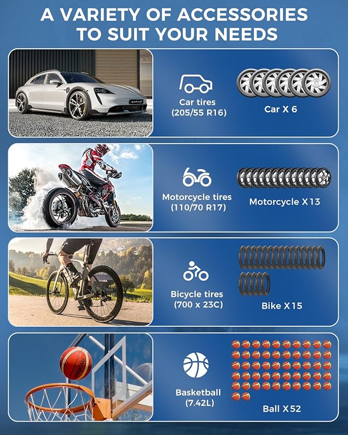 - Recommended Uses For Product : 7 in 1 tire inflation all vehicles - cars, SUVs, sedans, EVs, minivans, motorcycles, and bikes.