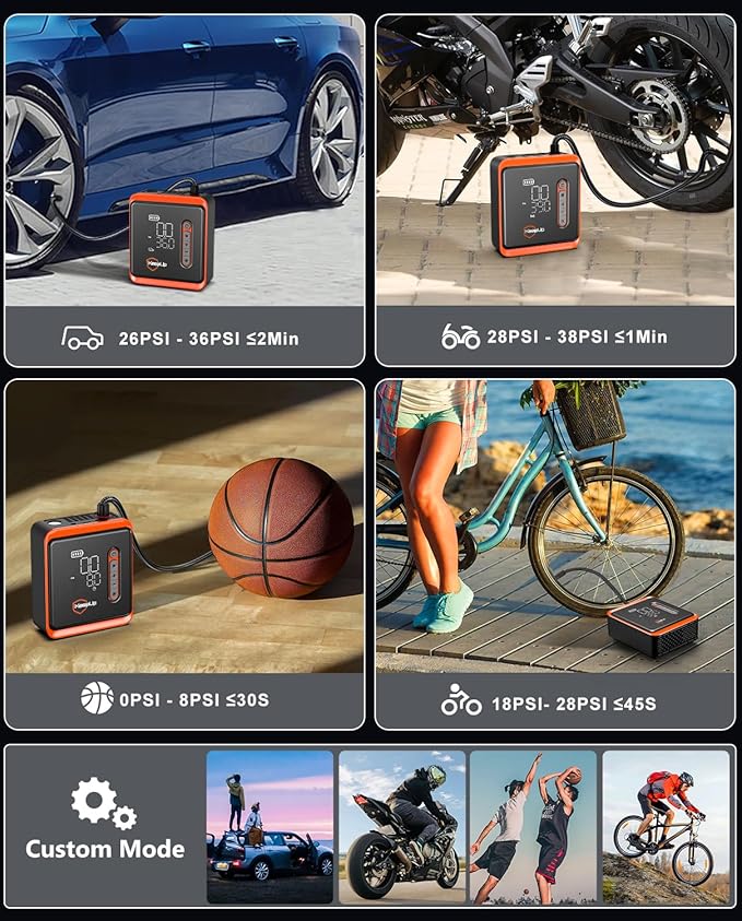 - ๐ ๐๐ฆ๐๐ซ๐ญ ๐๐จ๐๐๐ฌ: 5 preset modes for cars, motorcycles, bikes, and sports balls, the portable air pump is easy to operate. You can also customize the pressure value (2-150 PSI) for different inflation objects. Whether you're at home, on the road, or on a trip, this compact and user-friendly tire inflator is a powerful solution for your pumping needs.