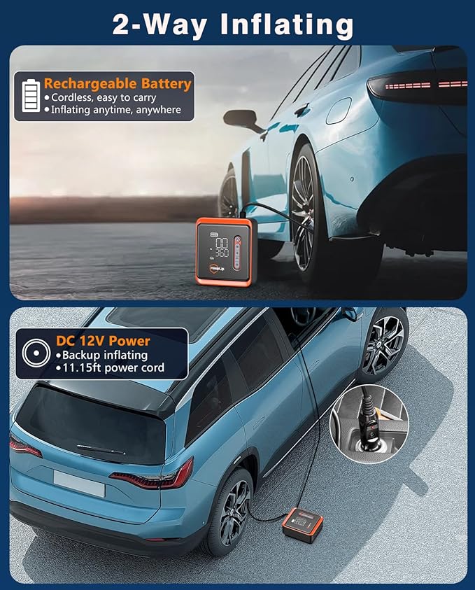 - ๐๐จ๐ง๐ -๐๐๐ฌ๐ญ๐ข๐ง๐ & ๐๐จ๐ซ๐-๐ ๐ซ๐๐: The tire pump has 2 ways to use it, it can be used wirelessly and you can also use the car cord to inflate it when it has no power. The mini air pump is equipped with a durable rechargeable battery that provides up to 40 minutes of continuous air pumping without the need for external AC or DC power. You can use it to inflate cars, motorbikes, E-bikes, bicycles, basketballs, SUP, and other inflatables without worrying about cords or outlets.