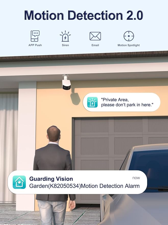 - Motion Detection 2.0 and Strobe light & Audible Warning: Equipped with person and vehicle detection, this wide angle security camera can differentiate between objects to prevent false alarms. When motion is detected, in addition to sending push notifications to your phone, the camera also has flashing lights and speakers to alert people and cars that they are being recorded.