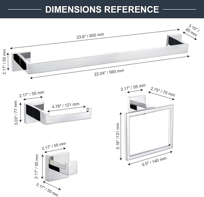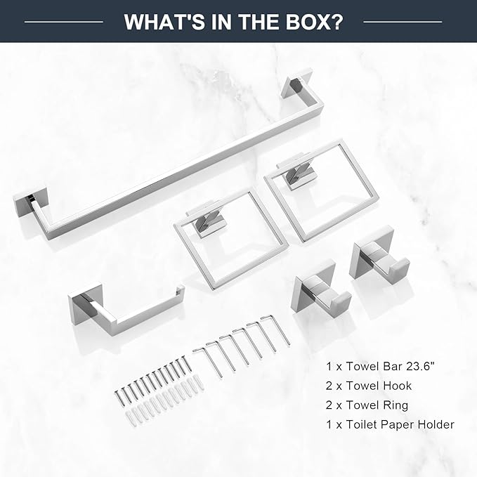 - 【Unique Design】- The Bathroom Towel Bar Sets features a modern polished chrome finish and a unique square shape and concealed mounting hole add a touch of modern design to your bathroom.