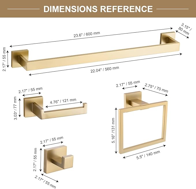 - 【Unique Design】- The Bathroom Towel Bar Sets features a modern brushed gold finish and a unique square shape and concealed mounting hole add a touch of modern design to your bathroom.