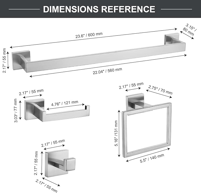 - 【Unique Design】- The Bathroom Towel Bar Sets features a modern brushed nickel finish and a unique square shape and concealed mounting hole add a touch of modern design to your bathroom.