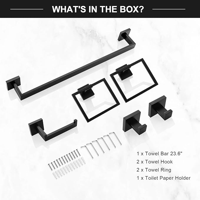 - 【6 Pieces Bathroom Hardware Set】- 1 x towel bar(23.6-Inch), 1 x toilet paper holder, 2 x towel ring, 2 x coat hook, screw hardware pack(for screw-mount), and installation instructions. we give you a preferential combination to meet your needs.