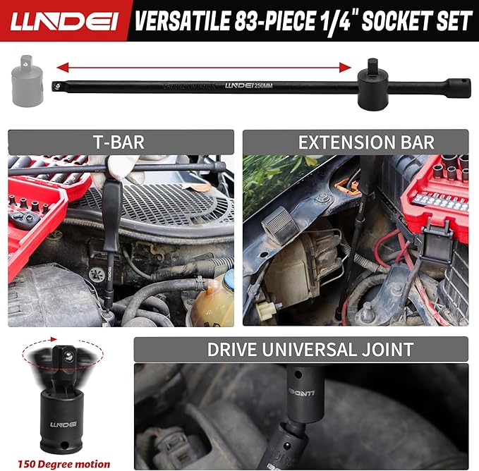 - 【DURABLE CRV MATERIAL】: LLNDEI 1/4 drive socket set is forged from heat-treated chrome vanadium steel and has a corrosion-resistant black phosphate coating for enhanced durability. Note: The grease on the surface of the sockets is applied to prevent rusting.