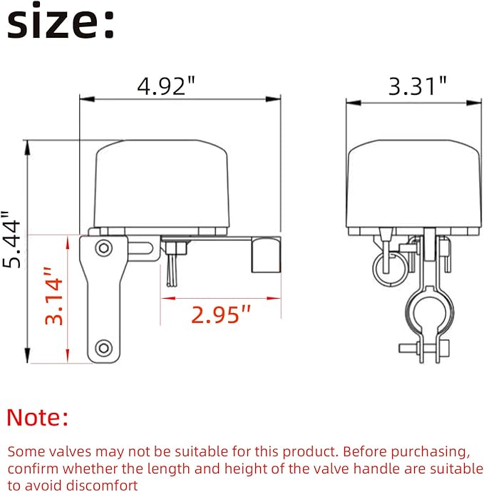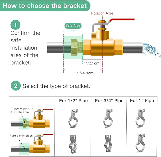 - >>>NOTICE: Before purchasing, please carefully confirm the type and size of the valve to avoid installation problems.<<< ๐ ๏ธEasy Install๏ผTwo types of brackets are available, compatible with 1/2", 3/4", 1" water pipes (1.5" not supported). Or the range of water pipe diameter is: 20mm~44mm.