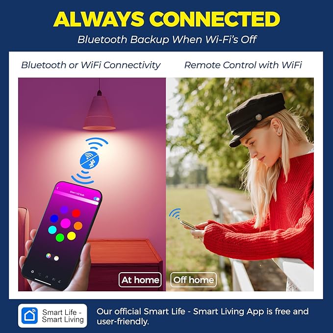 - Flexible Configuration: Connect locally via Bluetooth or Wi-Fi, and enjoy remote control via Wi-Fi when you're away. After setup, the bulb intelligently switches between Bluetooth and Wi-Fi as needed. (Note: Wi-Fi setup requires both 2.4GHz Wi-Fi and Bluetooth for initial pairing. Bluetooth-only setup requires just Bluetooth.)