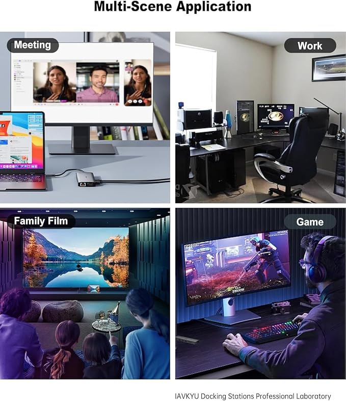 - 【13-in-1 Docking Station|Instant Triple-Screen Setup】 Expand laptops via USB-C into 13 ports with this USB C Docking Station. Enables laptop docking station dual monitor + 3-monitor workflow (docking station 3 monitors). Dual HDMI 4K@60Hz + VGA arranges screens for research/docs/video calls. Dual HDMI Docking Station achieves dual 4K, while 3 screens stabilize at 1080P@60Hz. ▲ Mac: Mirror mode only.