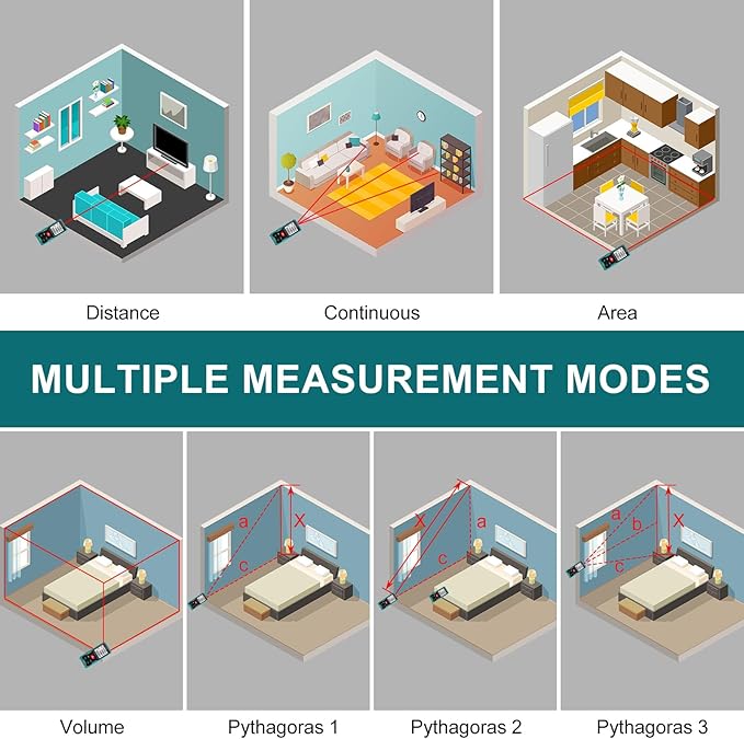 - 【MULTIPLE MEASUREMENT FUNCTIONS】 Area, distance, length, volume, continuous measurement, Pythagorean method - three points; addition and subtraction; low battery indicator; 99 sets of data memory; manual deletion of data; automatic shutdown after 150 seconds of no operation , save power.