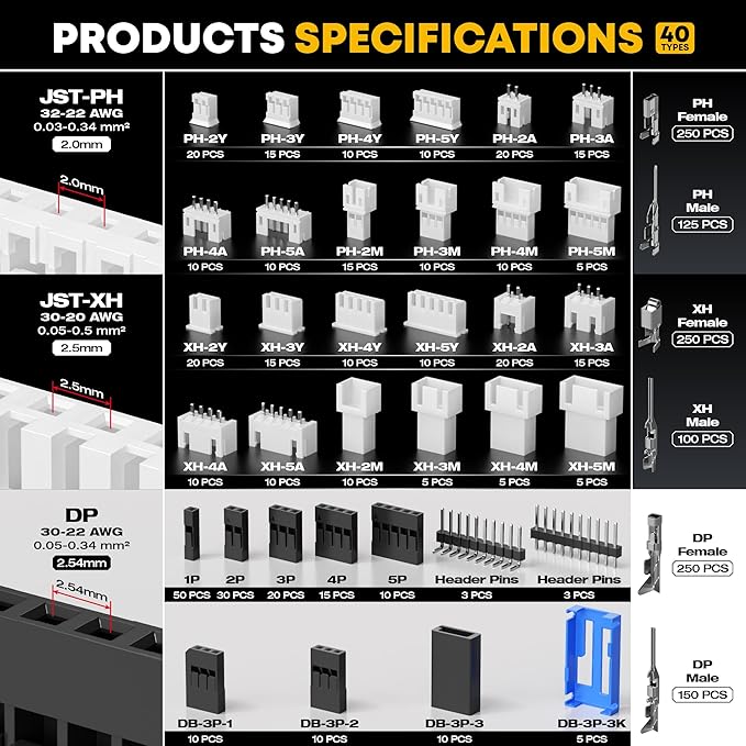 - Versatile Design: This set includes crimping pliers, wire strippers, and 40 different types and sizes of connectors (including Dupont 2.54 mm, JST-XH 2.5 mm and JST-PH 2.0 mm connectors) to meet various application scenarios.