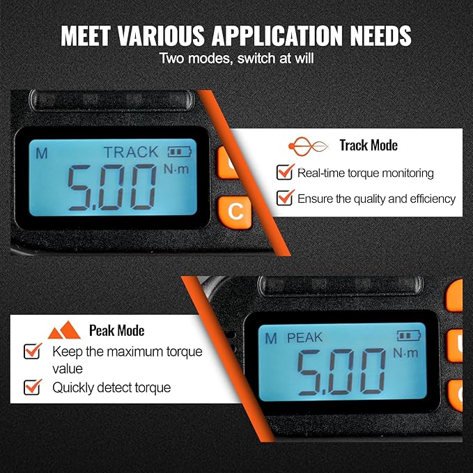 - Real-Time & Peak Mode: In real-time mode, the torque screwdriver displays the current torque value in real-time, allowing you to adjust and control the torque accurately according to your needs. In peak mode, it records and displays the maximum torque value, suitable for tasks that require detecting and recording torque peaks, such as checking and calibrating torque wrenches or testing and debugging car engines.