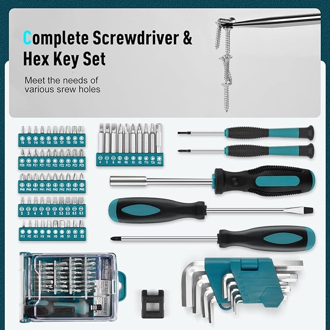 - 【Extensive Tools】- Tool kit includes claw hammer, spirit level, tape measure (metric and imperial), hex wrench set, wire strippers, screwdriver, water pump pliers, ratchet wrench set, adjustable wrench, combination wrench, needle nose pliers, precision screwdriver Kit, electrical tape, wood screw combination kit, scissors, voltage pen and other common tools.