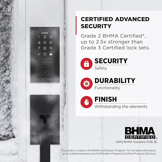 - CERTIFIED ADVANCED SECURITY: Security, Durability and Finish are Grade 2 BHMA certified, which is up to 2.5x stronger than Grade 3 BHMA Certified lock sets