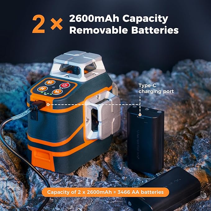 - 22H Long-Lasting Rechargeable Batteries: The 12 line laser level laser includes two 2600mAh rechargeable batteries, offering up to 11 hours of use at full brightness. With fast Type-C charging and the option to alternate batteries, enjoy extended working time for long-term projects.