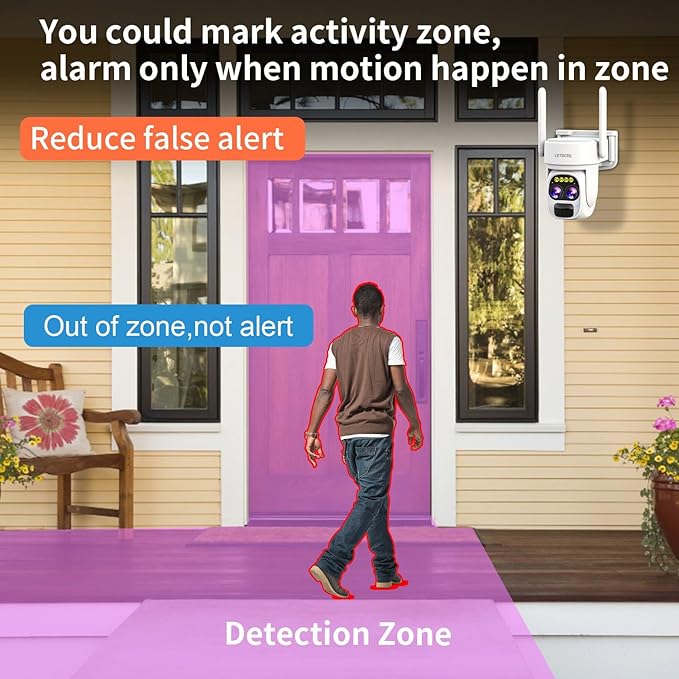 - 【Instant Alerts &Siren & Flashlight】 Home security camera. When a stranger in camera view outside of your house. You would receive message in seconds,You could see who comes and goes. Siren and flash spotlight could be set to automatic when people come in camera view or mannual turn on. The motion zone feature is free for you. You could cover the area you don't want to receive notification(like street). Reduce fault alert, focus on the important matter