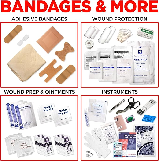 - ESSENTIAL FIRST AID ITEMS: The most comprehensive and complete kit covers minor wounds, scrapes, burns, eye injuries and trauma injuries.