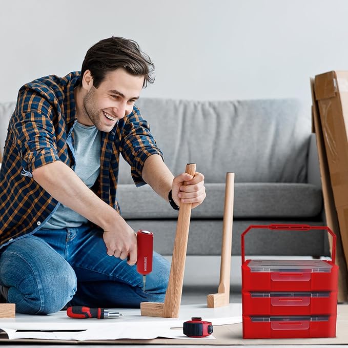 - 2-layer portable stakable box: The first layer is electric cordless screwdriver set, and the second layer is nine-grid storage box